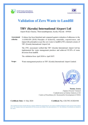 Through effective implementation of its waste management strategy, Thiruvananthapuram International Airport has become India's first airport to earn the Zero Waste to Landfill (ZWL) recognition from the Confederation of Indian Industry (CII). This recognition showcases TIAL’s dedication to sustainability and its commitment to environmental stewardship.