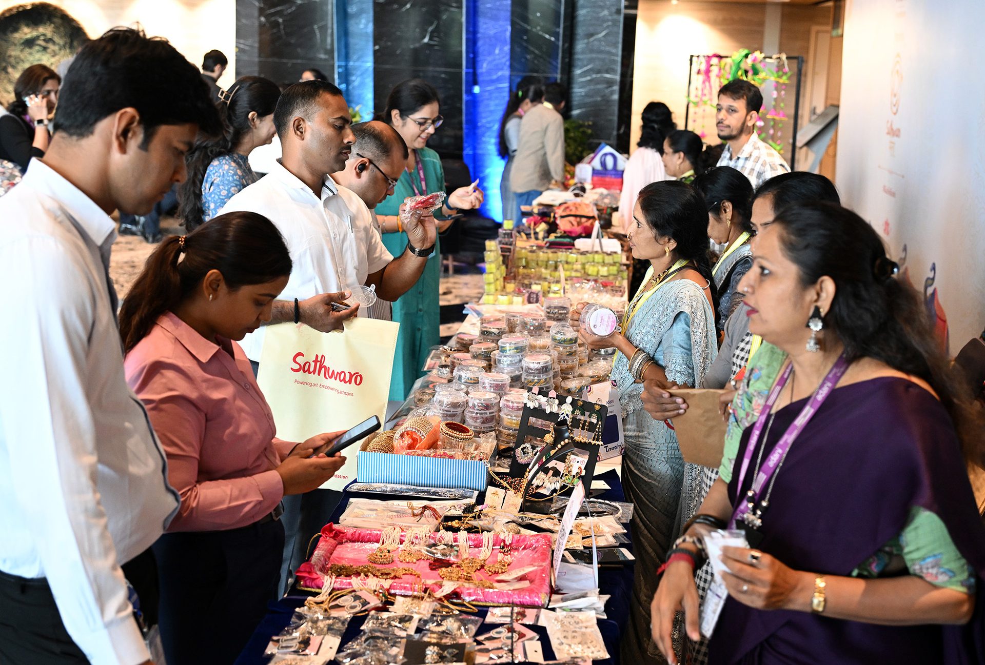 Sathwaro means together and its logo embodies unity, representing the strength of holding and embracing one another. Sustaining art and artisans, Sathwaro strives to empower artisans through fresh and contemporary designs while meeting modern demands. At the exhibitions, artisans learn the importance of marketing and quality control that help them with design precision and maintaining the quality of craft items as per the demands of the market.